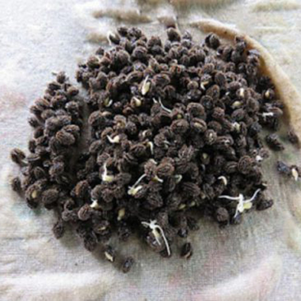 4. ขั้นตอนสุดท้ายใส่ดินที่เตรียมไว้ลงในถุงเพาะแล้วปักไม้ลงกลางถุงลึกประมาณ 1 เซนติเมตร เพื่อทำหลุมหลอดเมล็ด ทำการหยอดเมล็ดที่รากงอกแล้วลงในถุงแล้วกลบดินรดน้ำให้ชุ่ม เมื่อกล้าอายุครบ 40 วันก็สามารถนำปลูกลงแปลงได้เลย