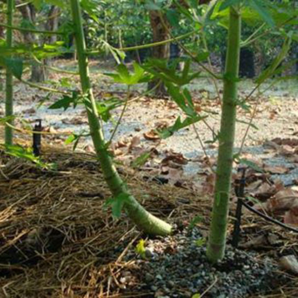 เลือกต้นมะละกออายุประมาณ 40 วัน ให้จับต้นมะละกอให้เอนอย่างเบามืออย่าให้ต้นเสียหายแล้วหาก้อนหินที่น้ำหนักสัมพันธ์กับขนาดต้นแล้วนำไปวางทับโคนต้นไว้ ต้นมะละกอที่โตขึ้นเอนไปตรงข้ามกับด้านที่ทับหินไม่ตั้งตรงอีก ในช่วงการปลูกให้เปลี่ยนขนาดก้อนหินตามขนาดต้นมะละกอที่ใหญ่ขึ้นเรื่อยๆ เมื่ออายุ 3 เดือน ก็ให้เอาก้อนหินออกไม่ต้องวางก้อนหินทับแล้ว