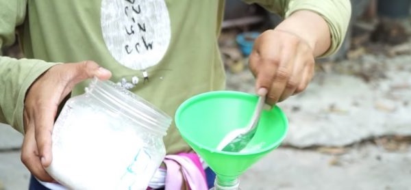 2. จากนั้นก้นำน้ำตาลทราย 3 ช้อนโต๊ะ ใส่ลงไปในขวดพลาสติกที่เตรียมไว้