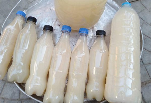 3. แล้วใส่น้ำซาวข้าวที่เตรียมไว้ตามลงไป ใส่ลงไปให้เกือบเต็มขวดได้เลย เหลือพื้นที่ไว้สักหน่อย เพื่อให้มีที่ระบายอากาศได้บ้างก็พอ
