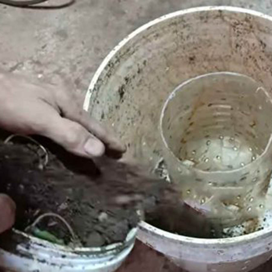 3. จากนั้นให้เติมดินจนเต็มถังสีแต่เว้นไว้ไม่ต้องเติมใส่ขวดพลาสติกตรงกลาง